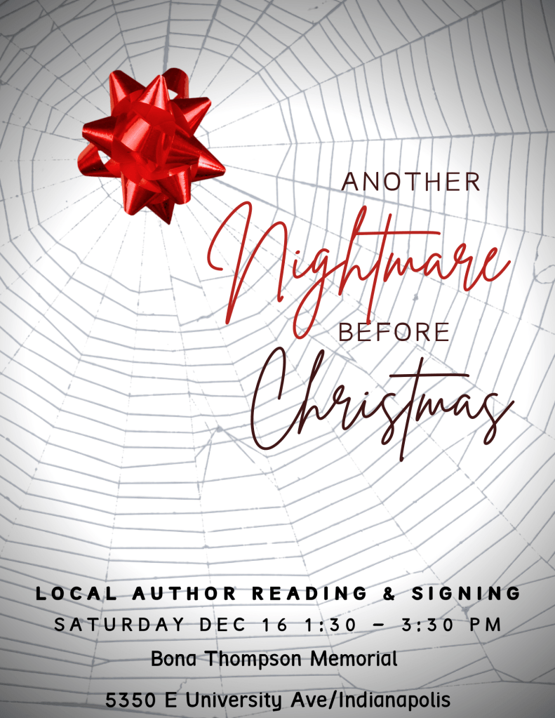 UPCOMING EVENTS! ANOTHER NIGHTMARE BEFORE CHRISTMAS RETURNS!!! SATURDAY, DECEMBER 16, 2023 Like your Christmas spooky? thrilling? strange? funny? Join me and other Indiana authors and artists at the Irvington Historical Society, Bona Thompson Center from 1:30 to 3:30 for a meet and greet, book reading, & book signing. Share this: Click to share on X (Opens in new window) X Click to share on Facebook (Opens in new window) Facebook Like Loading...